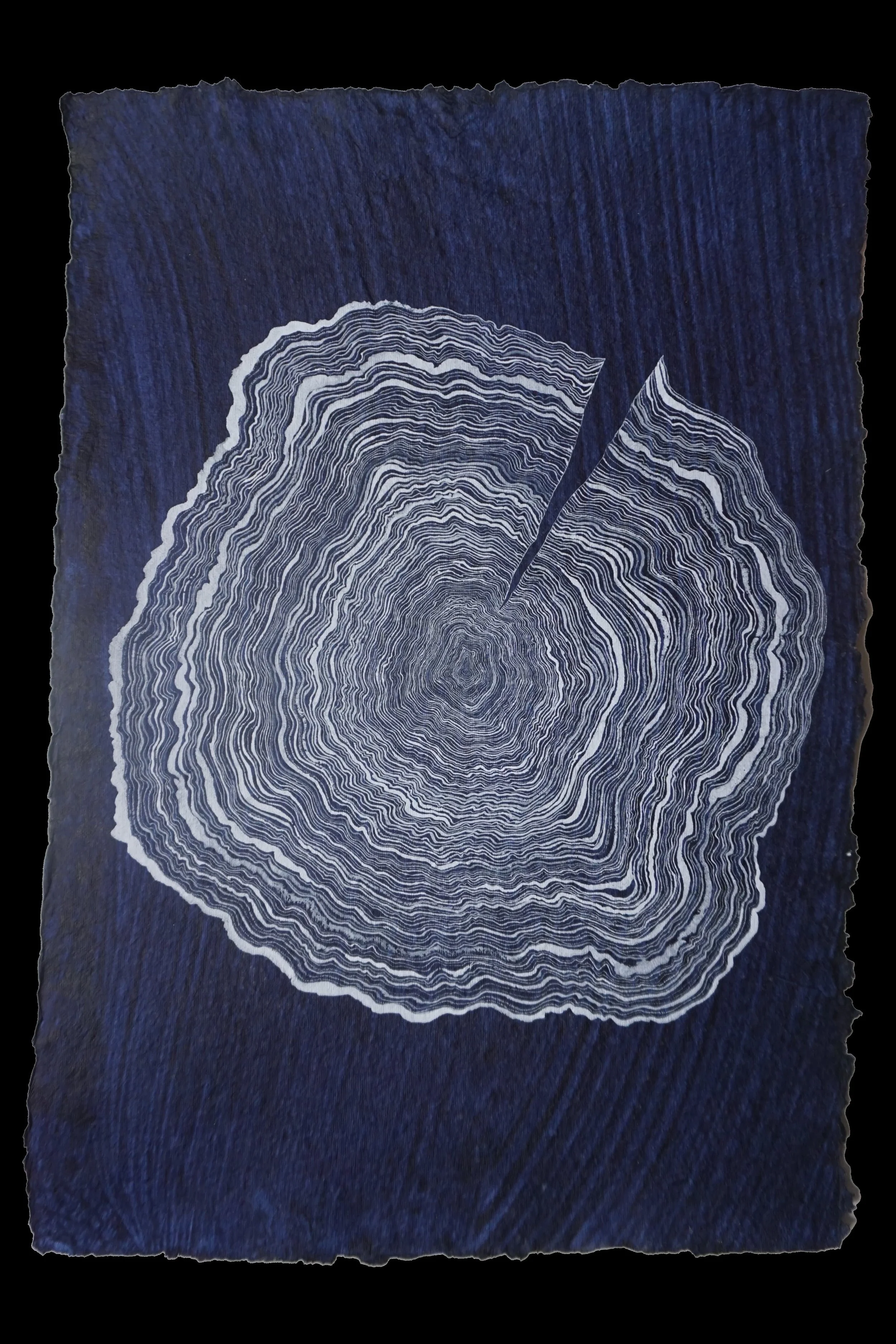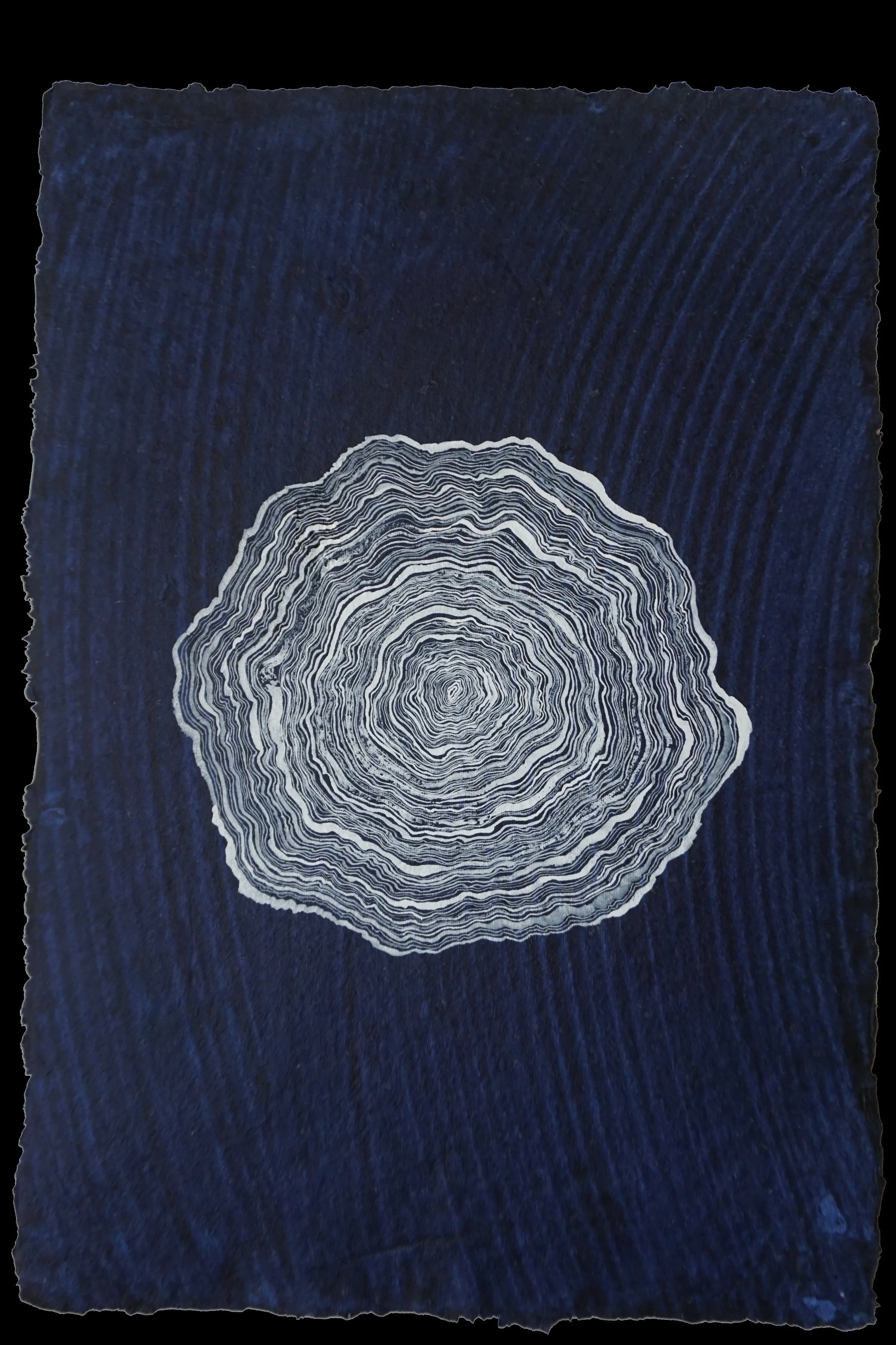 Earthing, in this meditative painting series, delicate lines trace the quiet rhythm of a tree’s life, expanding outward in gentle ripples of time. The indigo ground holds a stillness that invites contemplation, while the hand painted rings become a visual mantra on growth — slow, patient and enduring.
